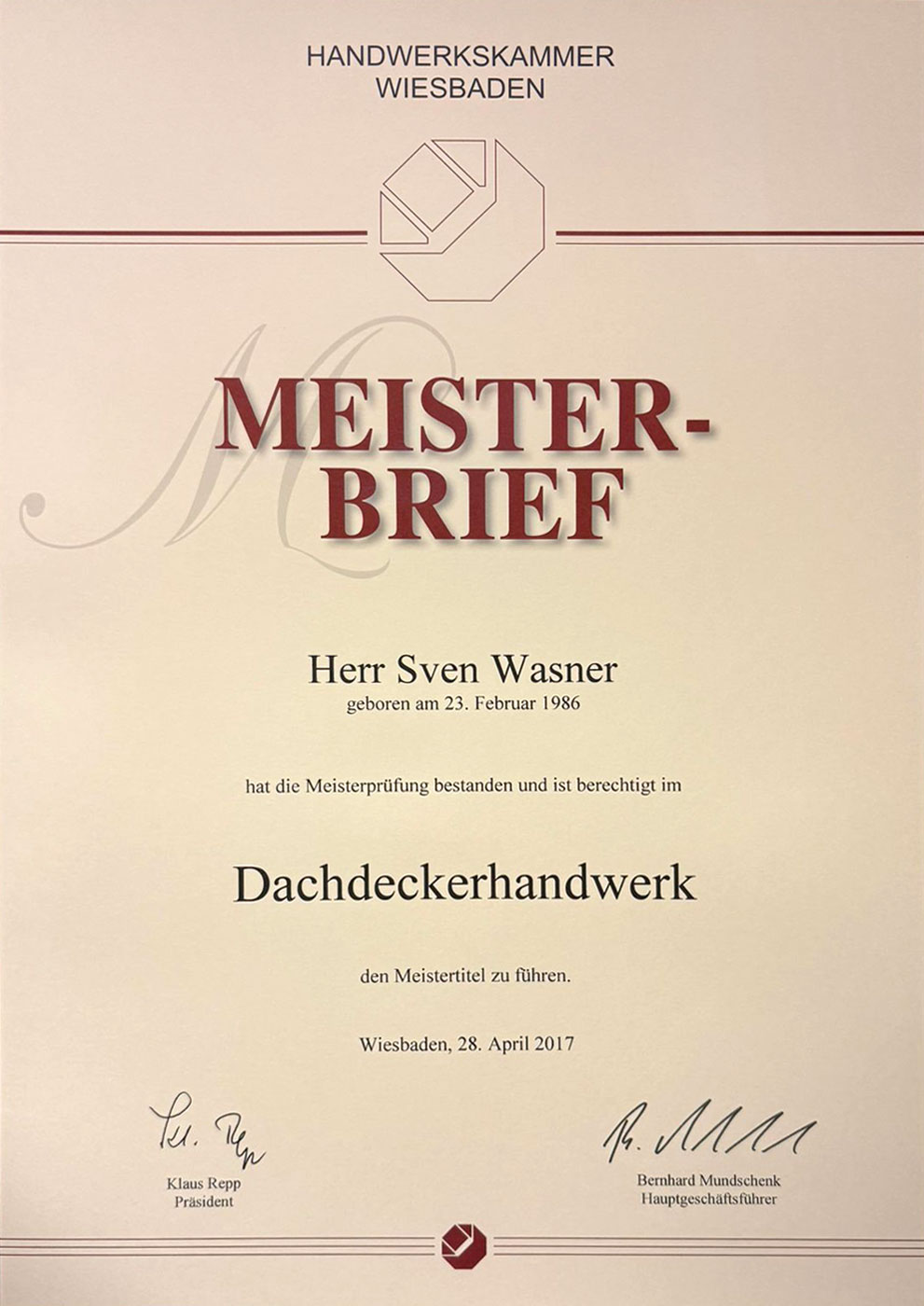 Seit Mai 2018 stehe ich, Sven Wasner, als Geschäftsführer und Dachdeckermeister an der Spitze unseres engagierten und qualifizierten Teams. Seit mehr als 20 Jahren bin ich als Dachdecker tätig und durfte in dieser Zeit wertvolle Erfahrungen in allen Bereichen des Dachdeckerhandwerks sammeln. Im April 2017 habe ich erfolgreich meine Meisterprüfung abgelegt – ein wichtiger Schritt, um unsere Kunden mit höchster handwerklicher Qualität und Fachwissen zu betreuen.